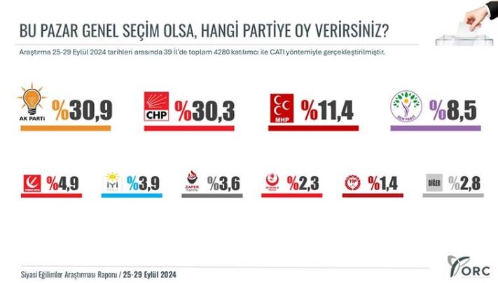 ORC Araştırma, eylül ayında 4 bin 280 kişiyle yaptığı son seçim anketinin sonuçlarını kamuoyu ile paylaştı.