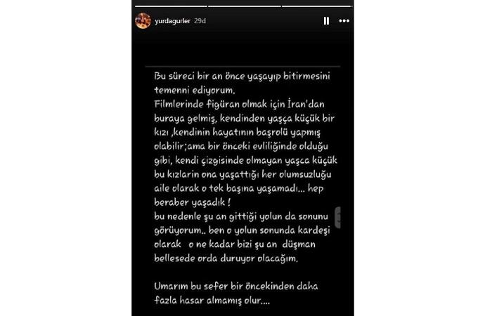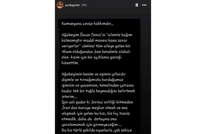 Özcan Deniz'in paylaşımları ardından bir açıklama da kız kardeşi Yurda Gürler'den geldi. Ard arda açıklamalarda bulunan Gürler yaşananlardan İranlı gelinleri Samar Dadgar'ı sorumlu tuttu.