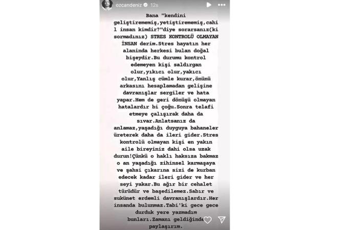 Ünlü şarkıcı, ilk olarak "...Stres kontrolü olmayan kişi en yakın aile bireyiniz dahi olsa uzak durun. Çünkü o, haklı haksıza bakmaz. O an yaşadığı zihinsel karmaşaya ve şahsi çıkarına sizi de kurban eder. Bu ağır bir cehalet türüdür ve baş edilemez. Sabır ve sükunet erdemli davranışlardır. Her insanda bulunmaz…" ifadelerini kullandı.