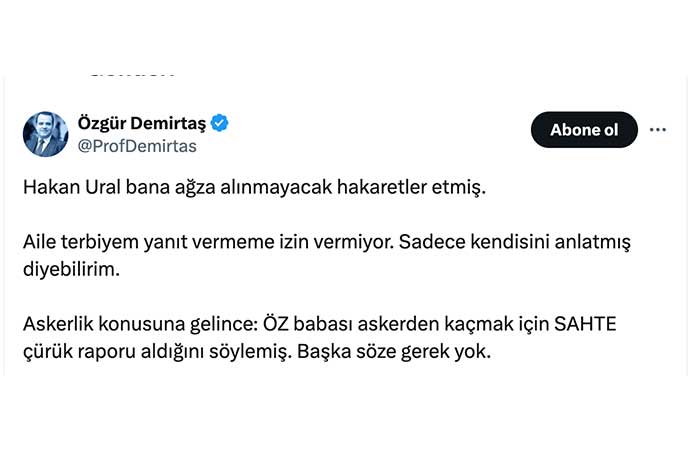 Özgür Demirtaş, sosyal medya hesabından “Hakan Ural bana ağza alınmayacak hakaretler etmiş. Aile terbiyem yanıt vermeme izin vermiyor. Sadece kendisini anlatmış diyebilirim. Askerlik konusuna gelince: ÖZ babası askerden kaçmak için SAHTE çürük raporu aldığını söylemiş. Başka söze gerek yok” diye yanıt verdi.