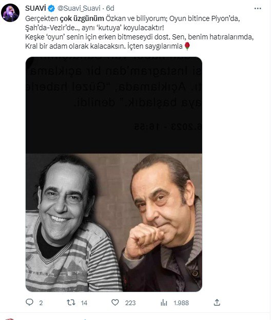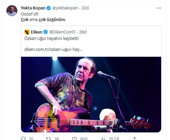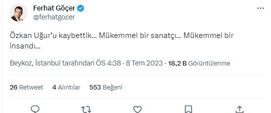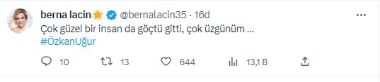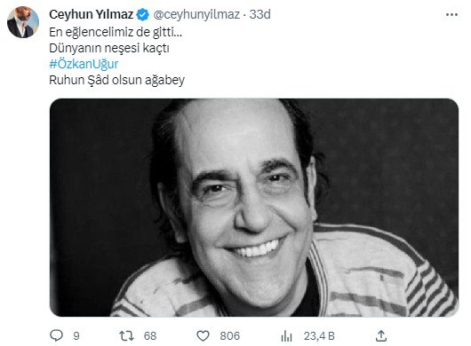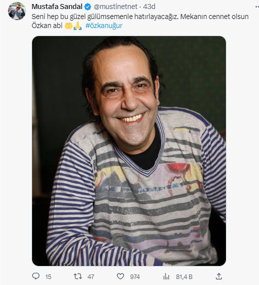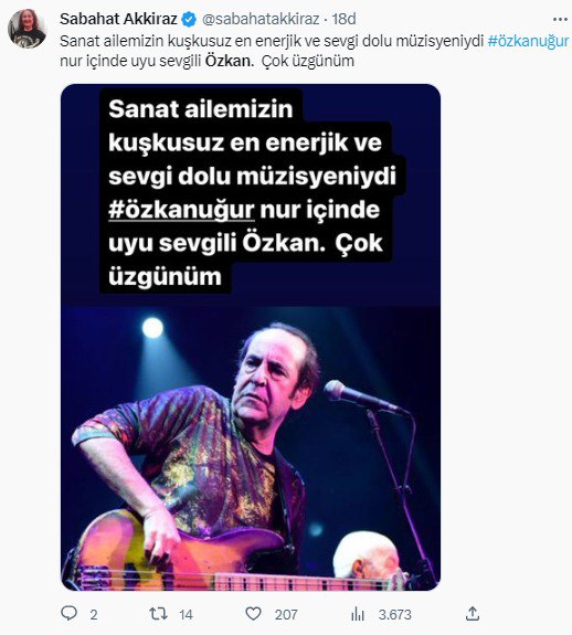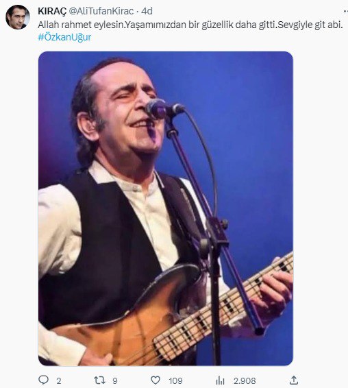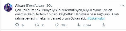 MFÖ müzik gurubun üyesi ve oyuncu Özkan Uğur, bir süredir yoğun bakım ünitesinde tedavi gördüğü hastanede bugün hayatını kaybetti. 69 yaşındaki Özkan Uğur’un ölümü Türkiye’yi yasa boğdu. Usta sanatçının hayatını kaybetmesi sonrası sanat dünyasından peş peşe taziye mesajları yayınlandı. İşte o paylaşımlardan öne çıkanlar…
