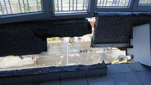 Duvarları kısmen yıkılan çatı katında oturan Esra Taflan, "Balkonda çamaşır makinesinin başındaydım. Birden patlama sesini duydum, devamında su ve taşların sesi geldi. Üst kattan geldiğini sanmıştık ama su olduğunu fark edince olmadığını anladık. Camdan dışarı bakmaya çalıştığımda sudan başka bir şey göremedim. Yan cepheye geçip de dışarı bakınca, alt kattaki mutfağımın balkon camının kırıldığını gördüm, içeriye su doluyordu. Çok korkuttu. Evde kedilerim var, yerlerinden fırladılar. Su, gür bir şelaleden akar gibi akıyordu" dedi.