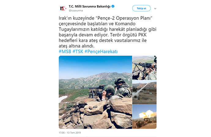 "Elde edilen gelişmeler sonucunda 12 Temmuz 2019 akşamı, Kara Kuvvetleri topçu bataryaları ve Hava Kuvvetlerimizin atışlarını müteakip saat 22.00'de Irak kuzeyinde teröristlerin yuvalandığı bölgelere karşı komando tugaylarımızla Pençe-2 Operasyon Planı çerçevesinde, tespit edilen farklı bir bölgede yeni bir harekat başlatılmıştır" ifadesi kullanılan açıklamada, operasyonun Hava Kuvvetleri, kara ateş destek vasıtaları, ATAK helikopterleri ve İHA’ların desteğinde planlandığı şekilde devam ettiği bildirildi.