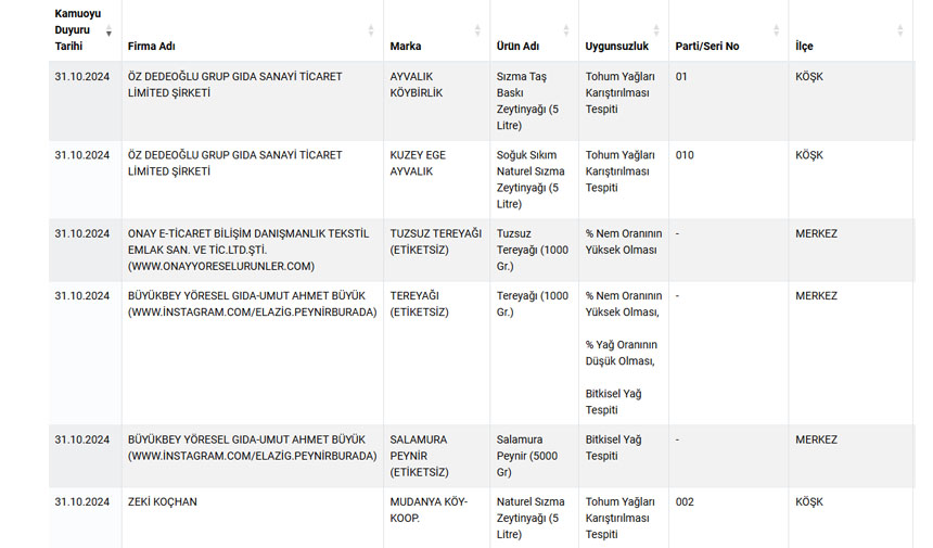 'Taklit veya Tağşiş Yapılan Gıdalar' listesine 31 Ekim'de eklenen markalar şu şekilde: