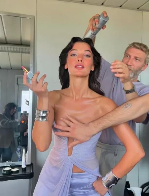 Hazırlık pozlarında Pınar Deniz'in dekoltesinde sürekli bir el olması sosyal medyanın diline düştü.