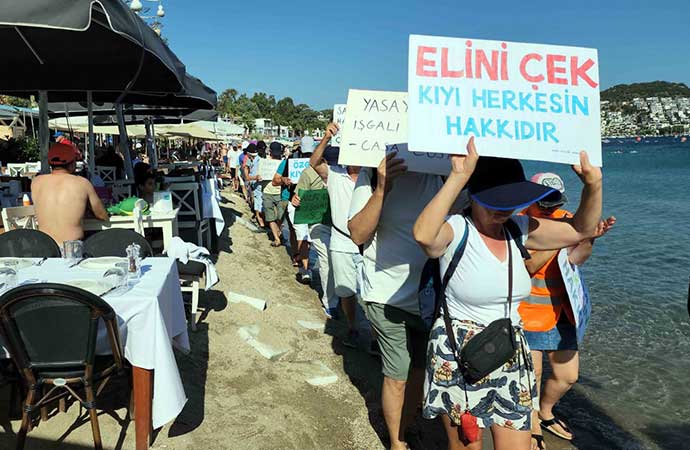 Bodrum’daki STK’ler ve çevre örgütleri ile siyasi parti temsilcilerinde destek verdiği eyleme yaklaşık 200 kişi ellerinde “Kıyılar Halkındır”, “Kıyı Kanununu Uygula”, “Elini Çek, Kıyılar Halkındır”, “Denize Erişim Herkesin Hakkı”, “Kıyılar Halkındır, Halkın Olacak” yazılı dövizlerle işgali protesto etti.