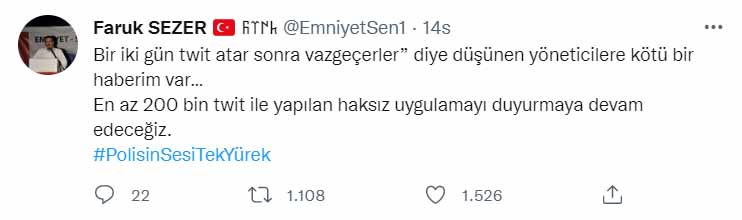 Emniyet-Sen Genel Başkanı Faruk Sezer, emniyet personelinin talepleri yerine getirilene dek sosyal medyadaki çalışmalarına devam edeceklerini söyledi. Sezer, "'Bir iki gün twit atar sonra vazgeçerler' diye düşünen yöneticilere kötü bir haberim var… En az 200 bin twit ile yapılan haksız uygulamayı duyurmaya devam edeceğiz." ifadelerini kullandı.