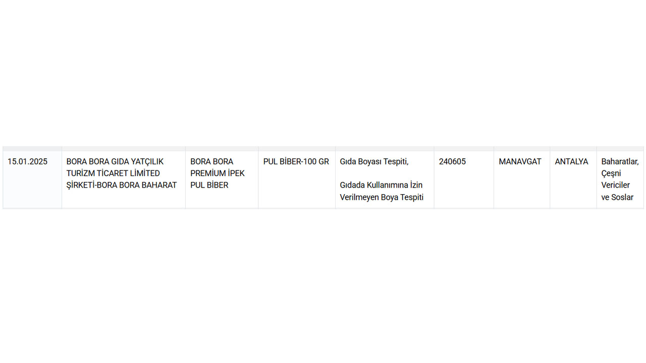 'Sağlığı Tehlikeye Düşürecek Gıdalar' listesine 15 Ocak Çarşamba günü eklenen bir firmanın pul biberinde 'Gıda Boyası' ve 'Gıdada Kullanımına İzin Verilmeyen Boya' tespit edildi.