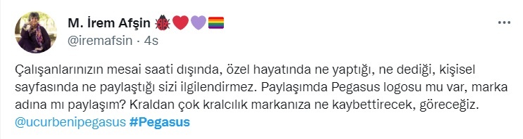 Pegasus'un söz konusu işten çıkarma kararı sosyal medyayı ikiye böldü. Kimi kullanıcılar paylaşımdaki 'Kadir gecesi özel' ifadesinin 'dini değerleri aşağılamak' olduğunu savundu. Karara karşı çıkanlar ise 'baskı kültürü' diyerek işten çıkarmanın kabul edilemez olduğunu belirtti. O paylaşımlar şöyle: