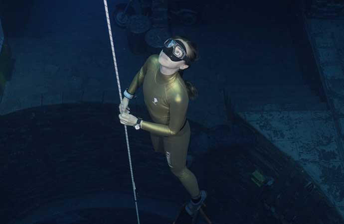 Dünya'nın en derin havuzunda dalış yapan Ercümen'e , Ukrayna Milli Takımı sporcusu ve "Deep Dive Dubai" takım lideri Natalia Zharkova eşlik etti.