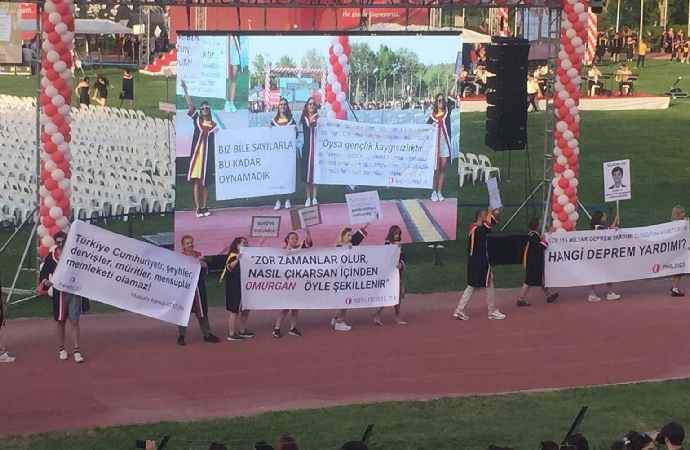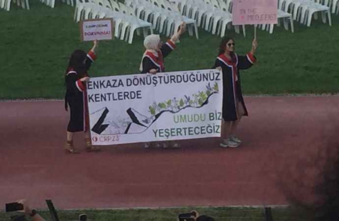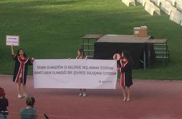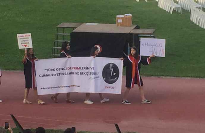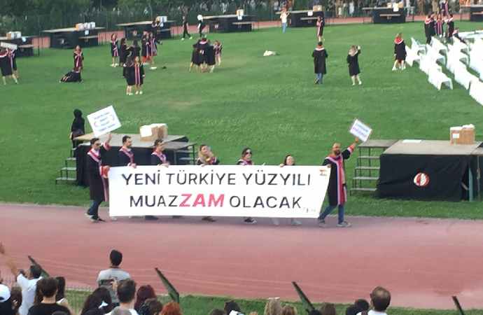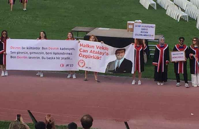 ODTÜ’de dün saat 18.30’da başlayan mezuniyet töreni öncesinde pankartlar güvenlik görevlileri tarafından kontrol edilerek Devrim Stadyumu’na alındı. ODTÜ’lüler kısıtlamalara rağmen yürüyüşte LGBTİ bayrağı açtı. Öğrenciler, ‘Verşan Kök ODTÜ’ye rektör olamaz’ sloganını attı. Törende; tutuklu TİP Hatay Milletvekili Can Atalay’ın da yer aldığı “Halkın vekili Can Atalay’a Özgürlük” pankartı taşındı.
