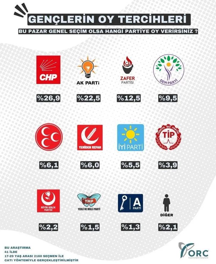 ORC sadece gençlerle yaptığı seçim anketinin sonuçlarını kamuoyuyla paylaştı. "Bu pazar genel seçim olsa hangi partiye oy verirsiniz?" sorusu soruldu.