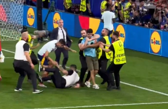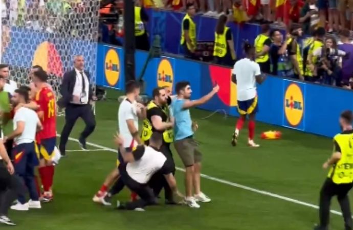 Sahaya atlayan bir taraftarı durdurmak isteyen güvenlik görevlilerinden biri İspanya'nın deneyimli golcüsü Alvaro Morata'nın dizine çarptı.