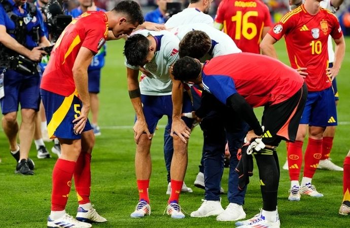 Güvenlik görevlisinin kendisine çarpmasıyla 31 yaşındaki futbolcu sağ dizinden bir sakatlık geçirdi. Acı içerisinde olduğu gözlenen Alvaro Morata'nın EURO 2024 finalinde oynamama ihtimali İspanyollar'da endişeye neden oldu.