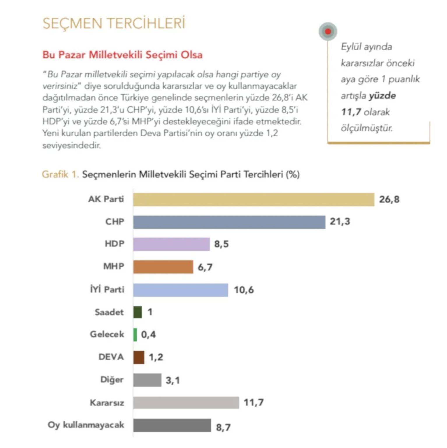 Seçmenlerin tercihleri, kararsızlar ve oy kullanmayacaklar dağıtılmadan şöyle: AK Parti 26,8, CHP 21,3, İYİ Parti 10,6, HDP 8,5, MHP 6,7, Kararsızlar 11,7, Oy kullanmaycak 8, 7. Araştırmada, kararsızların bir önceki aya göre 1 puan arttığı belirtildi.
