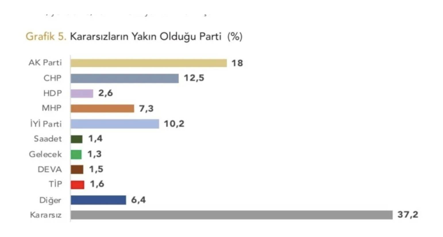 Kararsızların yakın olduğu partiler ise şöyle tespit edildi: yüzde 18 AK Parti, yüzde 12,5 CHP, yüzde 10,2 İYİ Parti, yüzde 7, 3 MHP, yüzde 2,6 HDP, yüzde 1,6 TİP, yüzde 1,5 DEVA, yüzde 1,4 SAADET, yüzde 1,3 Gelecek Partisi.
