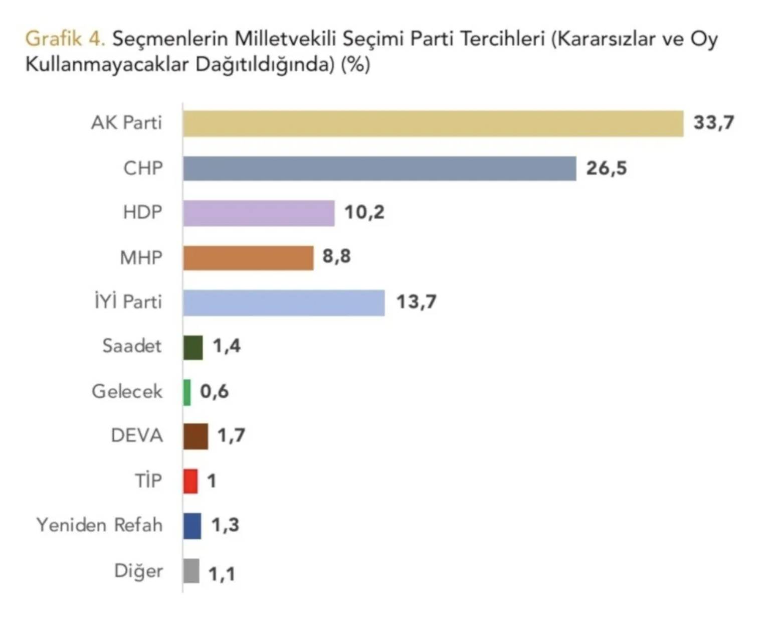 Kararsızlar, “yakın hissettiği parti”, “Cumhur İttifakı-Millet İttifakı tercihi” ve “ikinci parti tercihi” dikkate alınarak ; oy kullanmayacaklar ise oransal olarak dağıtıldığında çıkan sonuçlar ise şöyle: AK Parti 33,7, CHP 26,5, İYİ Parti 13,7, HDP 10,2, MHP 8,8, DEVA Partisi 1,7, Saadet Partisi 1,4, Yeniden Refah 1,3, TİP 1, Gelecek Partisi 0,6.