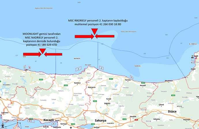 Olay, çarşamba günü akşam saatlerinde Türkeli açıklarında meydana geldi. İddiaya göre, Gürcistan'ın Poti Limanı'ndan İstanbul'a gelmek üzere hareket eden Liberya bayraklı MSC NADRIELY isimli konteyner gemisi, Türkeli açıklarına geldiği sırada Ukrayna uyruklu 2'inci kaptanı denize düştü. Kaptanın gemiden düştüğünün fark edilmesi üzerine arama kurtarma çalışmaları başlatıldı. Sahil Güvenlik uçağı ve botlarının da katıldığı çalışmalara, çevredeki diğer gemiler destek verdi. Yaklaşık 20 saat süren aramalar sonucunda MOONLIGHT isimli ticari gemi tarafından denizde bulunan 2'inci kaptan sağ olarak kurtarıldı.