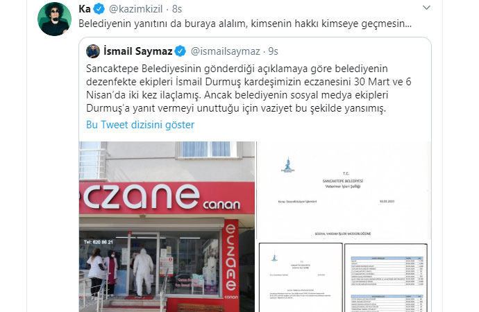 Sancaktepe Belediyesi'nin gazeteci İsmail Saymaz'a verdiği son yanıtı da sözlerinin sonuna şöyle ekledi: Belediyenin yanıtını da buraya alalım, kimsenin hakkı kimseye geçmesin...