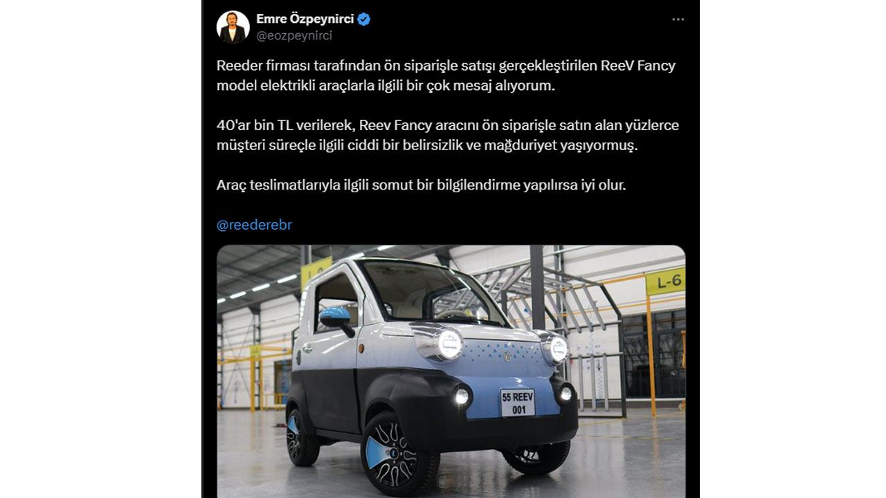 Gazeteci Emre Özpeynirci, 28 Ocak Salı günü sosyal medya hesabından yaptığı paylaşımda, "40'ar bin TL verilerek, Reev Fancy aracını ön siparişle satın alan yüzlerce müşteri süreçle ilgili ciddi bir belirsizlik ve mağduriyet yaşıyormuş. Araç teslimatlarıyla ilgili somut bir bilgilendirme yapılırsa iyi olur" demişti.