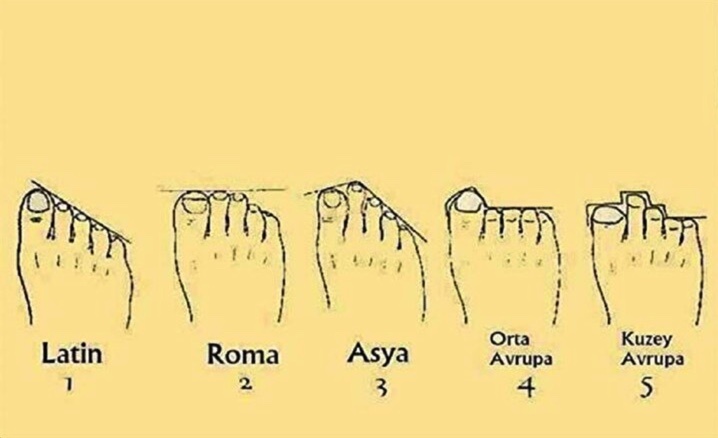 İlk üç parmağın eşit uzunlukta olduğu ayak tipi Roma'ya dayandığı, bu kişilerin düzenli ve herkes tarafından sevilen kişiler olduğu söyleniyor.