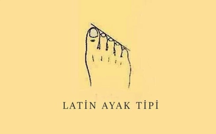 Parmaklar başparmaktan başlayarak simetrik şekilde küçülüyorsa Latin kökenli olabilirsiniz. Bu ayak tipine sahip olanların genelde boylarının kısa olduğu, bu kişiler için hayatın zor olabilir deniliyor.