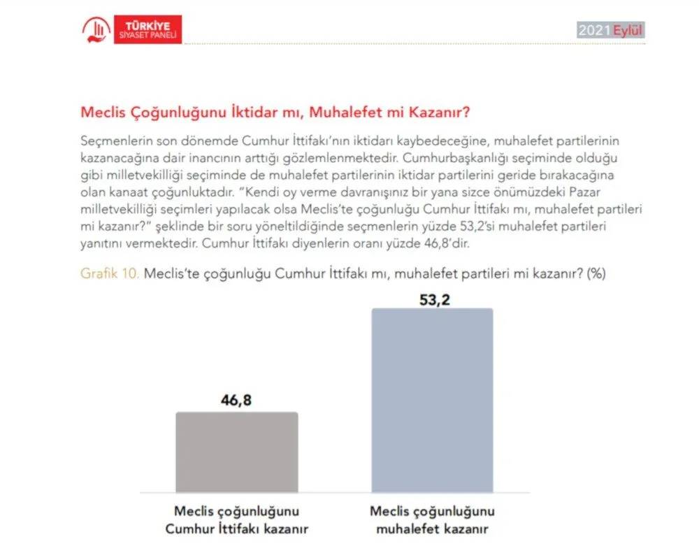 "Kendi oy verme davranışınız bir yana sizce önümüzdeki pazar Cumhurbaşkanlığı seçimleri yapılacak olsa seçimleri Cumhurbaşkanı Erdoğan mı muhalefet adayı mı kazanır?" sorusu sorulduğunda seçmenlerin yüzde 60,7’si muhalefetin Erdoğan karşısında seçimi kazanacağını düşündüğünü ifade etmektedir. Seçimi Cumhurbaşkanı Erdoğan’ın kazanacağını düşünenlerin oranı ise yüzde 39,3’tür.