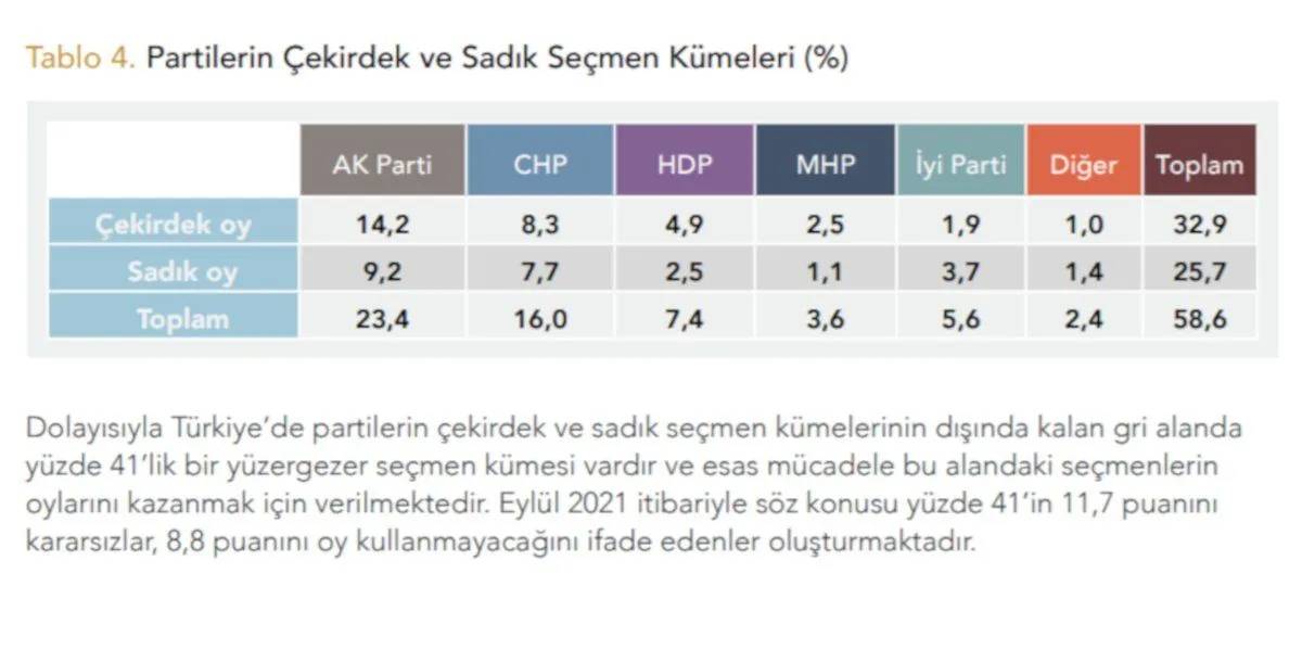 AK Parti’ye oy vermekten asla vazgeçmeyecek seçmen kümesi yüzde 14,2; CHP’ye oy vermekten asla vazgeçmeyecek seçmen kümesi yüzde 8,3; HDP’ye oy vermekten asla vazgeçmeyecek seçmen kümesi yüzde 4,9; MHP’ye oy vermekten asla vazgeçmeyecek seçmen kümesi yüzde 2,5 ve İYİ Parti’ye oy vermekten asla vazgeçmeyecek seçmen kümesi yüzde 1,9 olarak ölçüldü. Dolayısıyla Türkiye’de yaklaşık olarak yüzde 33’lük bir seçmen grubunun hiçbir koşulda oy tercihini değiştirmeyi düşünmediği sonucu çıkarılabilir.