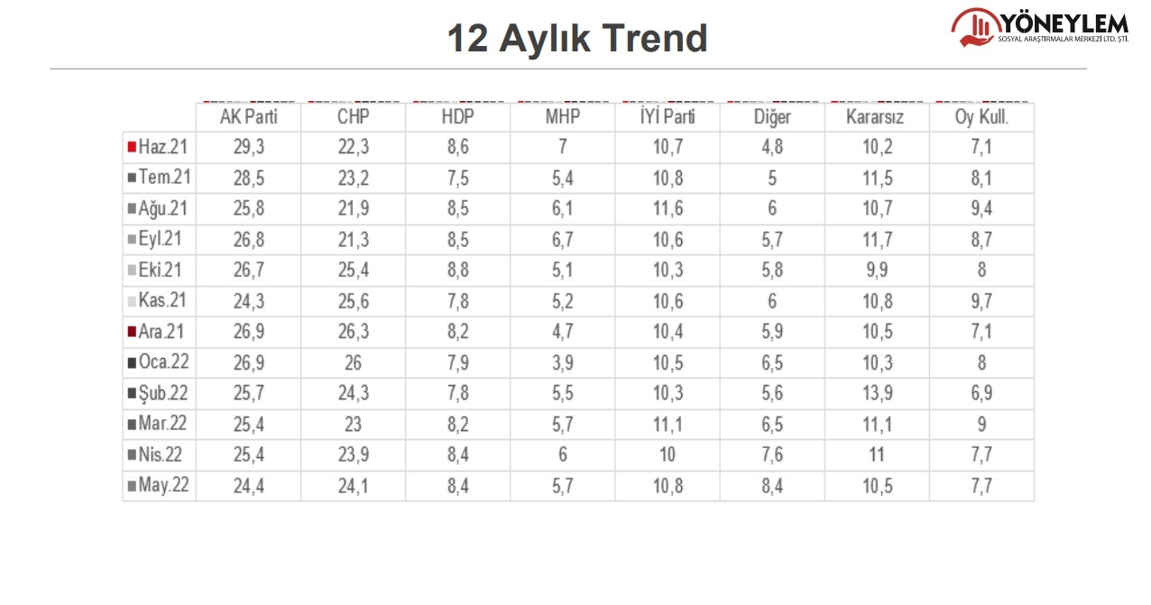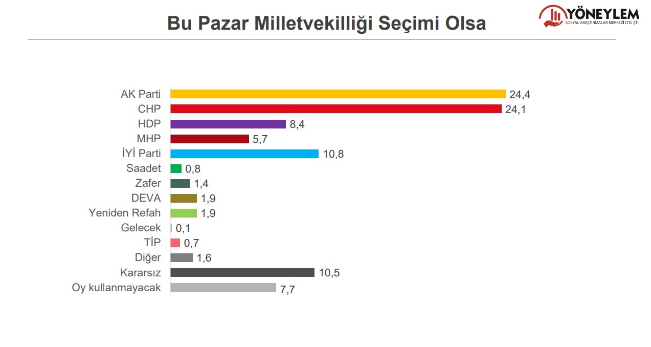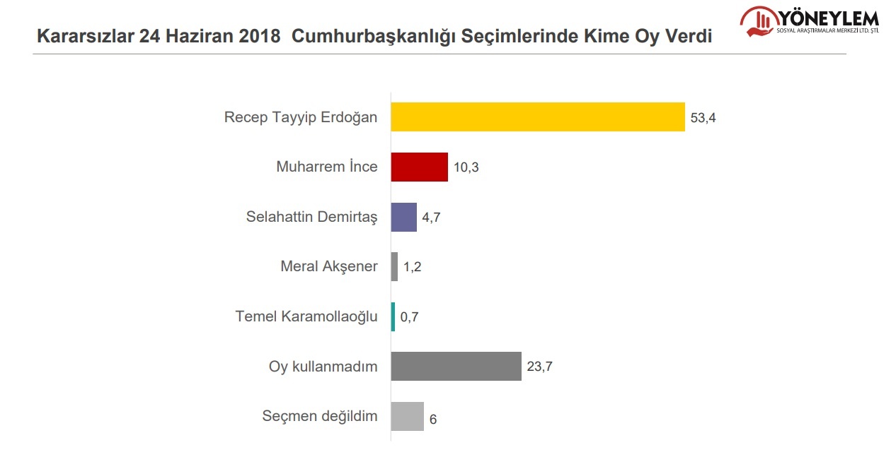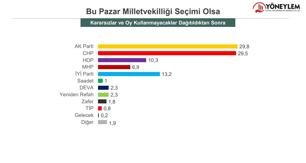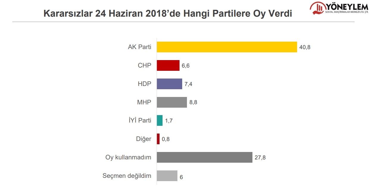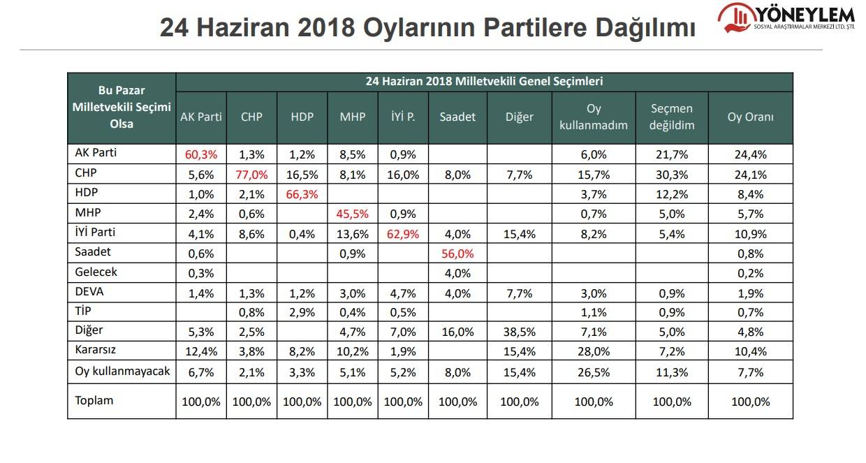 Buna göre, kararsızlar ve oy kullanmayacaklar dağıtılmadan partilerin oy oranları şu şekilde oldu: