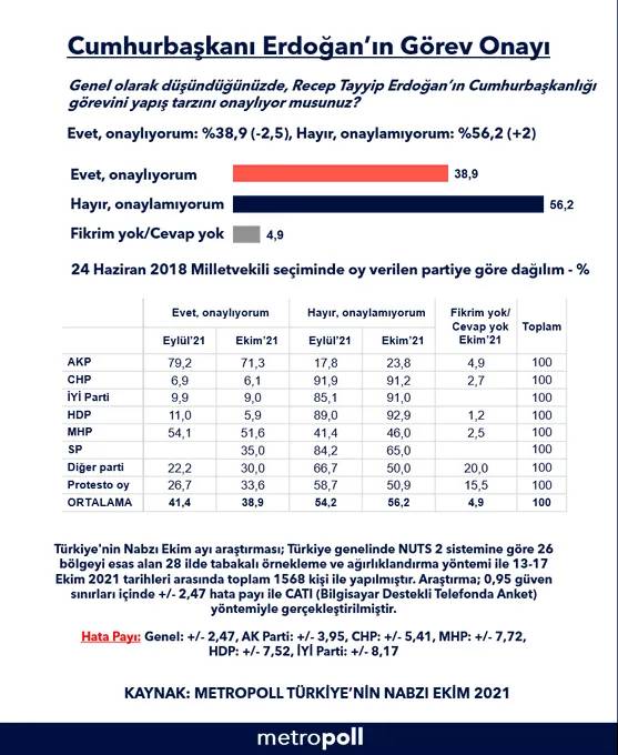 Erdoğan'ın görev onayı bir önceki ay yapılan araştırmaya 1.5 puan düştü. Eylülde yapılan araştırmada Erdoğan'ın görev onayı yüzde 41.4 idi. AK Parti seçmeni özelinde ise Erdoğan'ın desteği bir ayda yaklaşık 8 puan (yüzde 79.2'den yüzde 71.3'e) geriledi. Katılımcıların partilerine göre dağılımı şöyle: