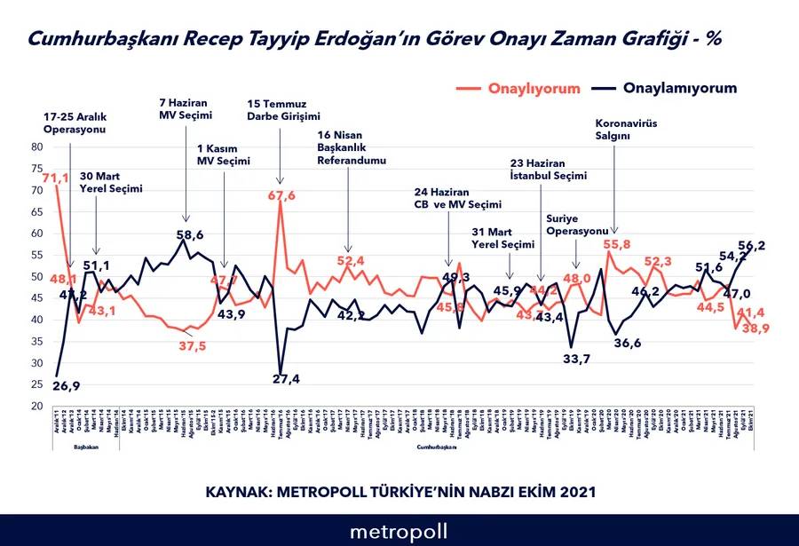 Duvar'ın haberine göre, araştırmada katılımcılara "Genel olarak düşündüğünüzde Recep Tayyip Erdoğan'ın Cumhurbaşkanlığı görevini yapış tarzını onaylıyor musunuz?" diye soruldu. Katılımcıların yüzde 38.9'u 'Onaylıyorum', yüzde 56.2'si 'Onaylamıyorum" yanıtını verdi. Yüzde 4.9 ise 'Fikrim yok/Cevap yok' seçeneğini işaretledi.