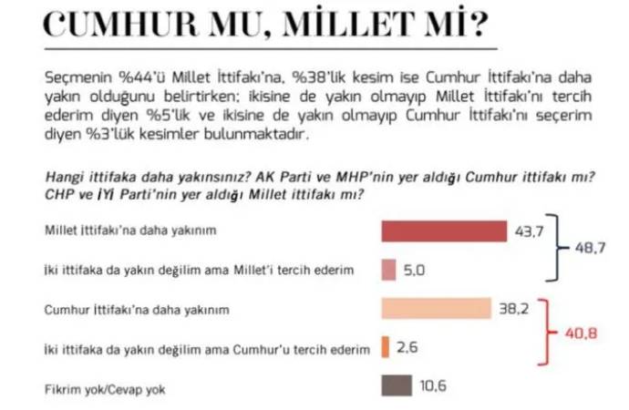 "İki ittifaka da yakın değilim ama Millet'i tercih ederim" diyenlerin oranı yüzde 5, "Cumhur'u tercih ederim" diyenlerin oranı yüzde 2.6 olarak hesaplandı.
