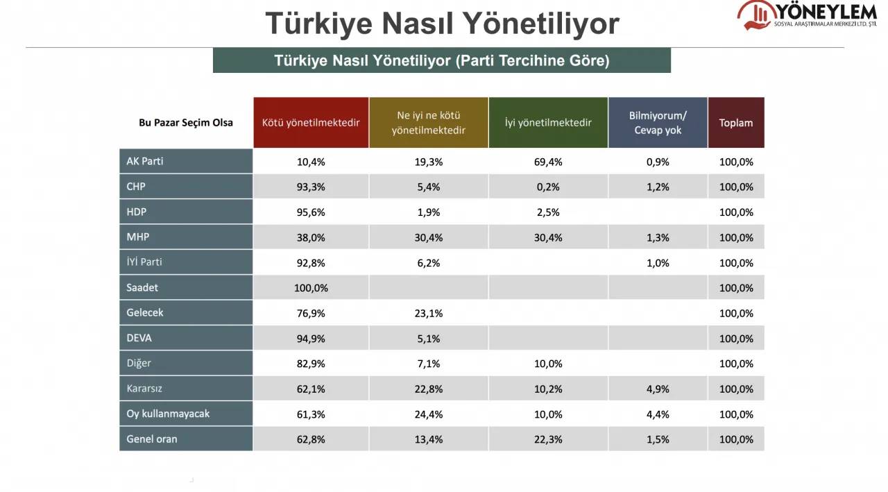 AKP seçmeninin yüzde 10'u Türkiye'nin kötü yönetildiğini düşünüyor. Türkiye'nin iyi yönetildiğini düşünenlerin oranı ise yüzde 69.4.