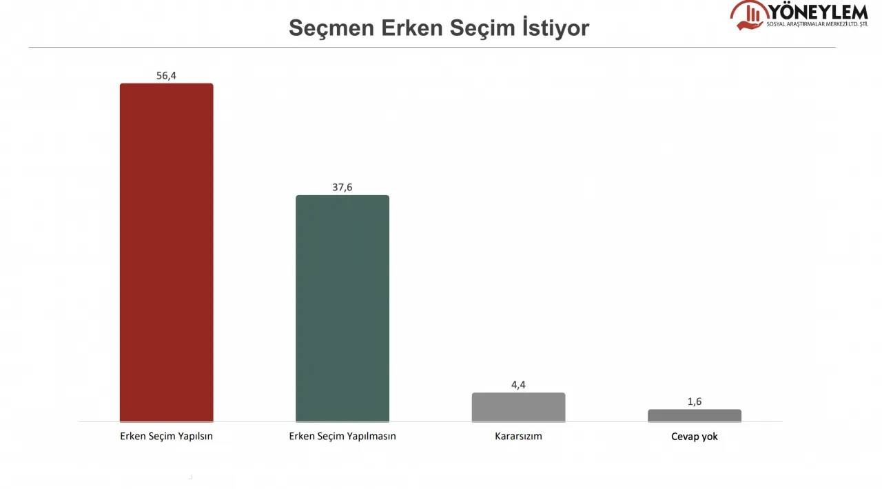 Seçmenin yüzde 56.4'ü erken seçim isterken, yüzde 37.4 erken seçimin yapılmasına karşı çıkıyor.