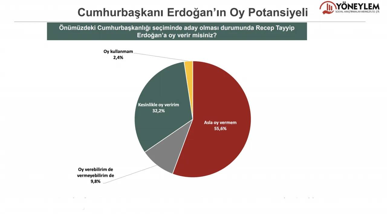 Erdoğan'a 'Asla oy vermem' diyenlerin oranı yüzde 55.6. 'Kesinlikle oy veririm' diyenlerin oranı ise 32.6.