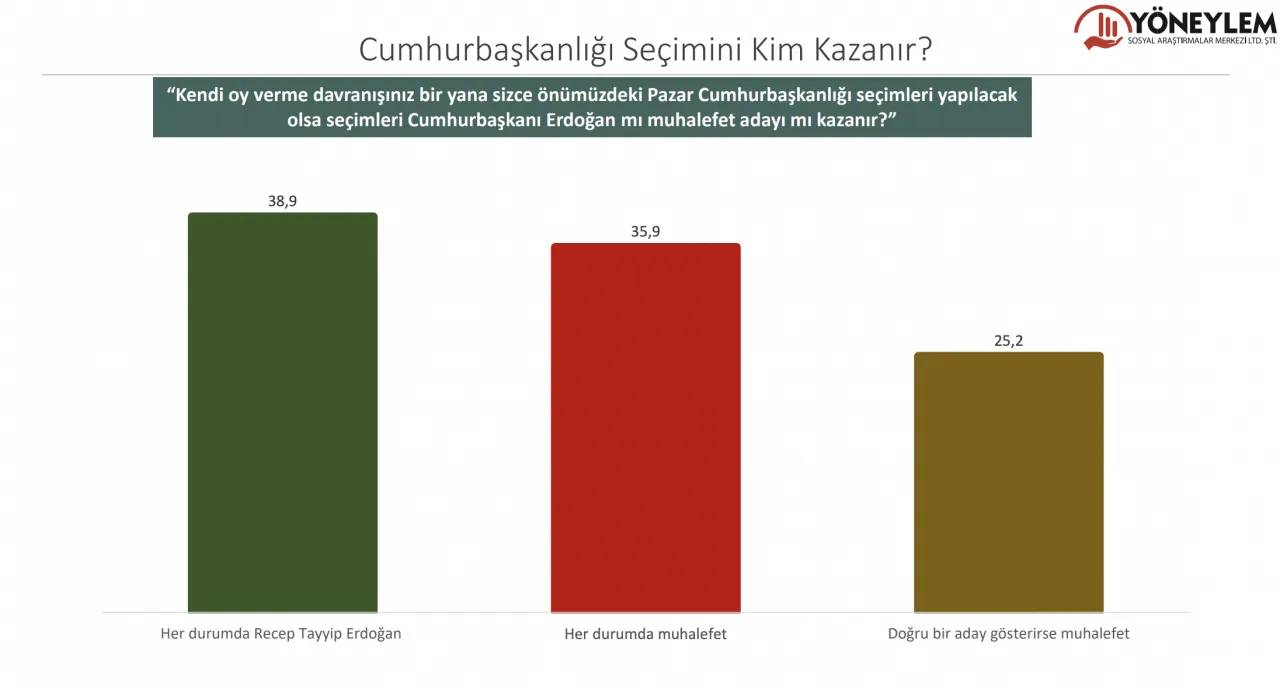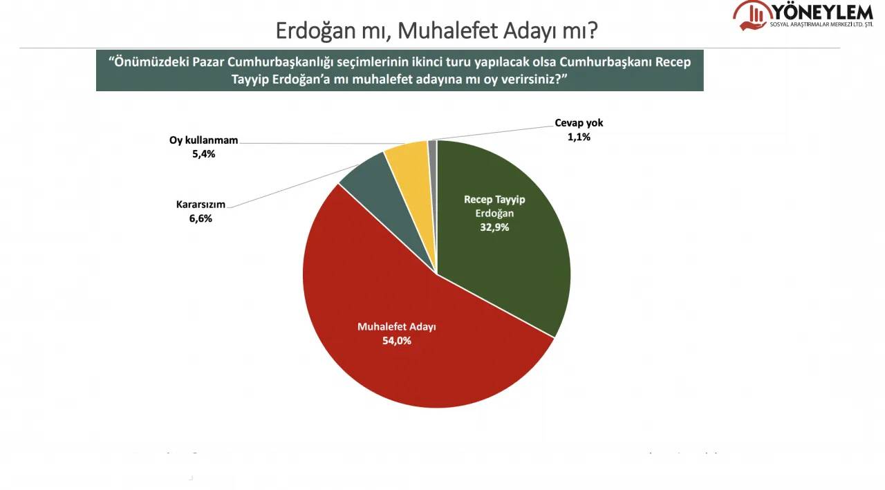 Yüzde 54, Erdoğan'ın karşısına hangi aday çıkarsa çıksın ona oy vereceğini söylüyor. Erdoğan'a oy vereceklerini söyleyenlerin oranı ise yüzde 32.9.