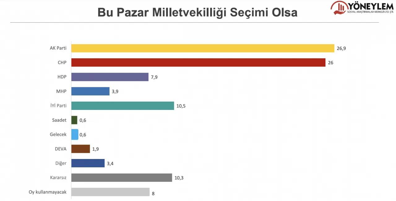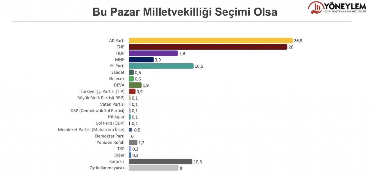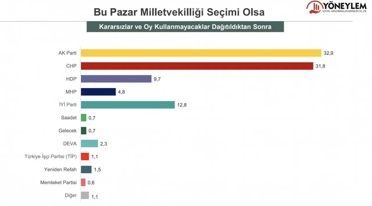 Araştırmaya göre kararsızlar dağıtıldıktan sonra AKP'nin oyu yüzde 32.9, CHP'nin oyu yüzde 31.8 olarak hesaplandı. Türkiye İşçi Partisi'nin oyu yüzde 1.1 ile Gelecek, SAADET ve Memleket partilerini geçti.