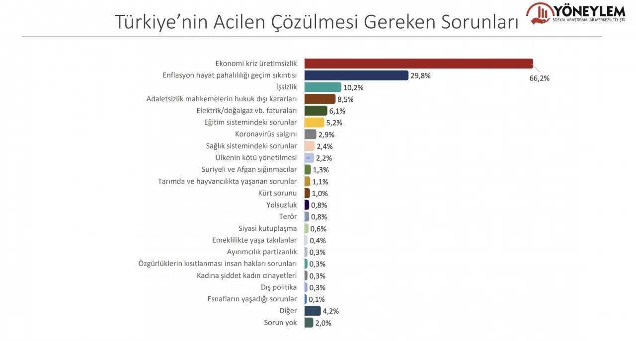 Türkiye'nin acil çözülmesi gereken sorunların başında yüzde 66.2 ile ekonomik kriz geliyor.