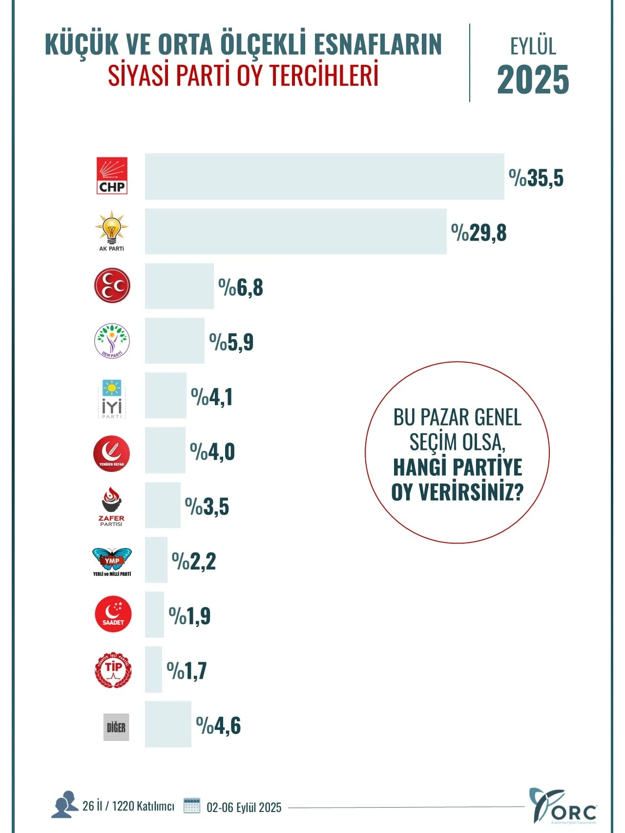 Türkiye'de yüksek enflasyon nedeniyle yurttaşın geçim derdi günden güne büyürken, erken seçim tartışmaları da sürüyor. Bu kapsamda anket şirketlerinin anketleri de devam ediyor. ORC Araştırma'nın 8 Eylül 2025 tarihinde yayınladığı son ankette, esnaf ve asgari ücretlilerin oy tercihleri belli oldu.