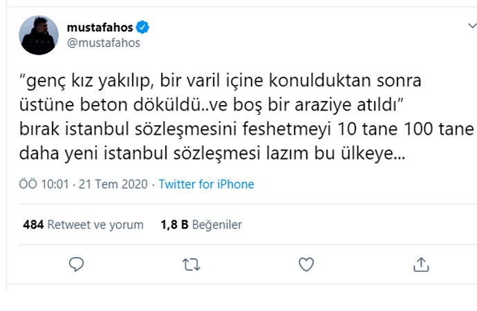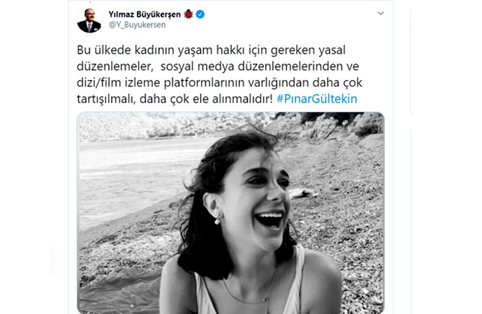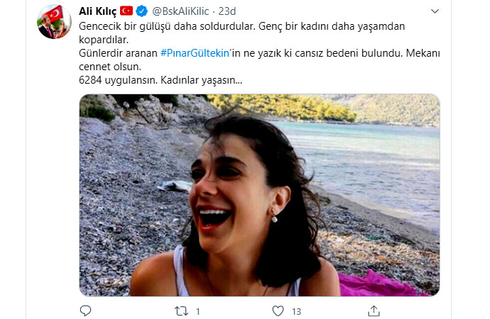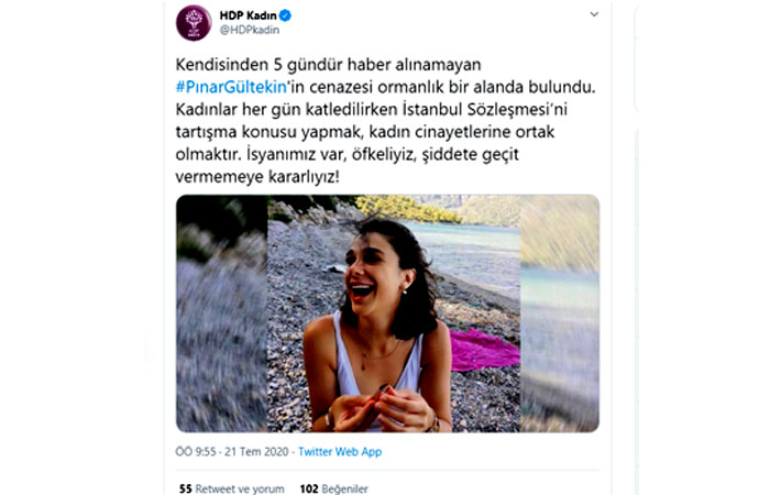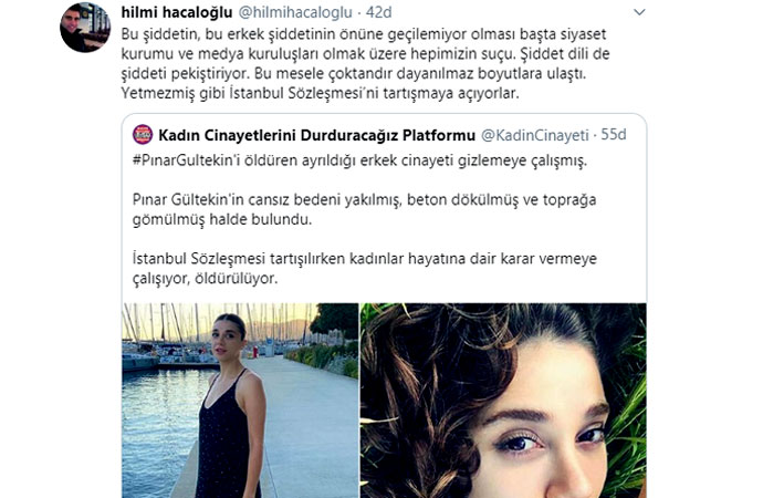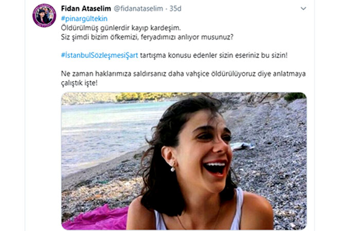Pınar Gültekin’in ardından sosyal medyada yapılan paylaşımlarda "Kadınlar her gün katledilirken İstanbul Sözleşmesi’ni tartışma konusu yapmak, kadın cinayetlerine ortak olmaktır" denildi.