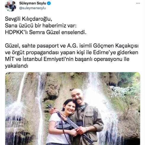Süleyman Soylu, PKK'lı Volkan Bora ile fotoğraflarının çıkmasının ardından dokunulmazlığı kaldırılan HDP'li Semra Güzel'in MİT ve İstanbul Emniyet Müdürlüğü operasyonuyla Edirne'ye giderken yakalandığını duyurduğu paylaşımda 'Sana üzücü bir haberimiz var' diyerek Kılıçdaroğlu'nu hedef aldı.