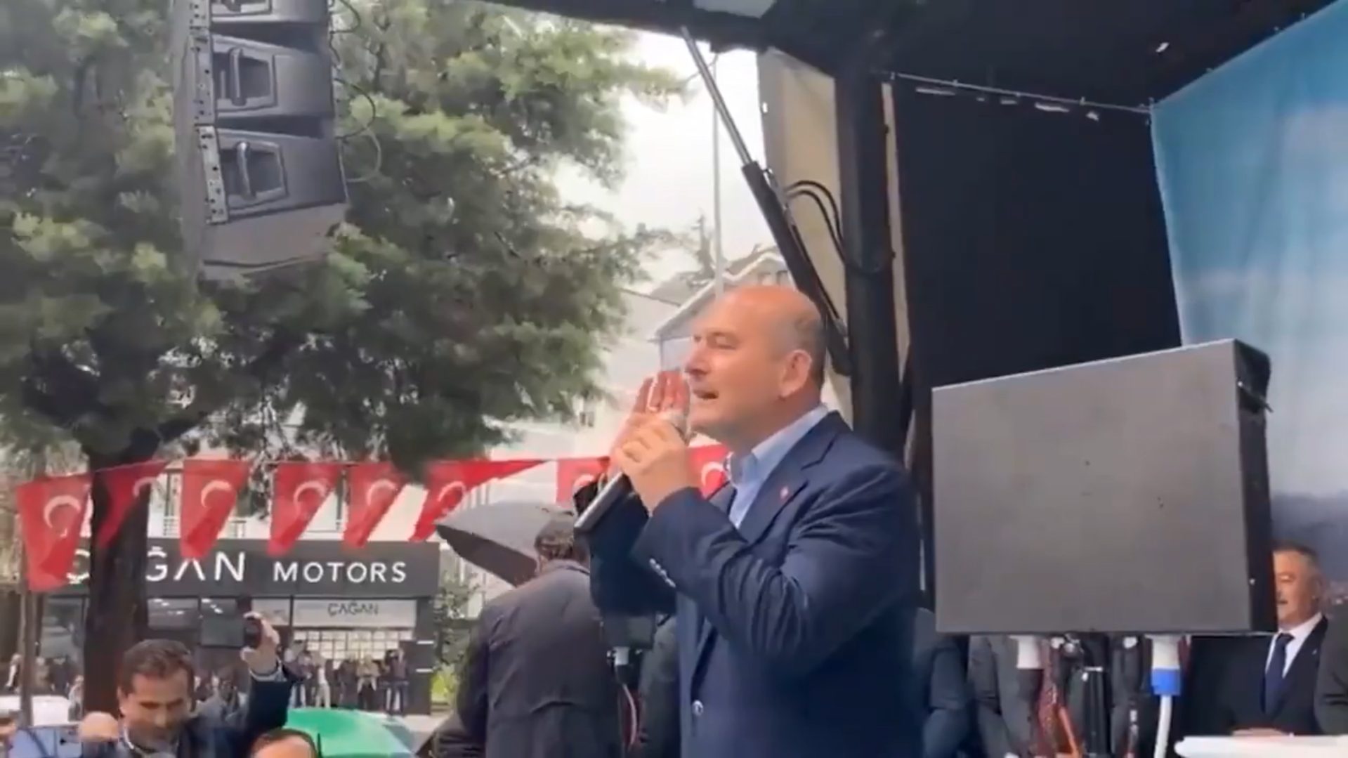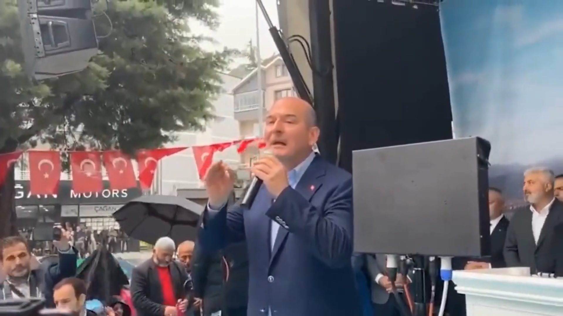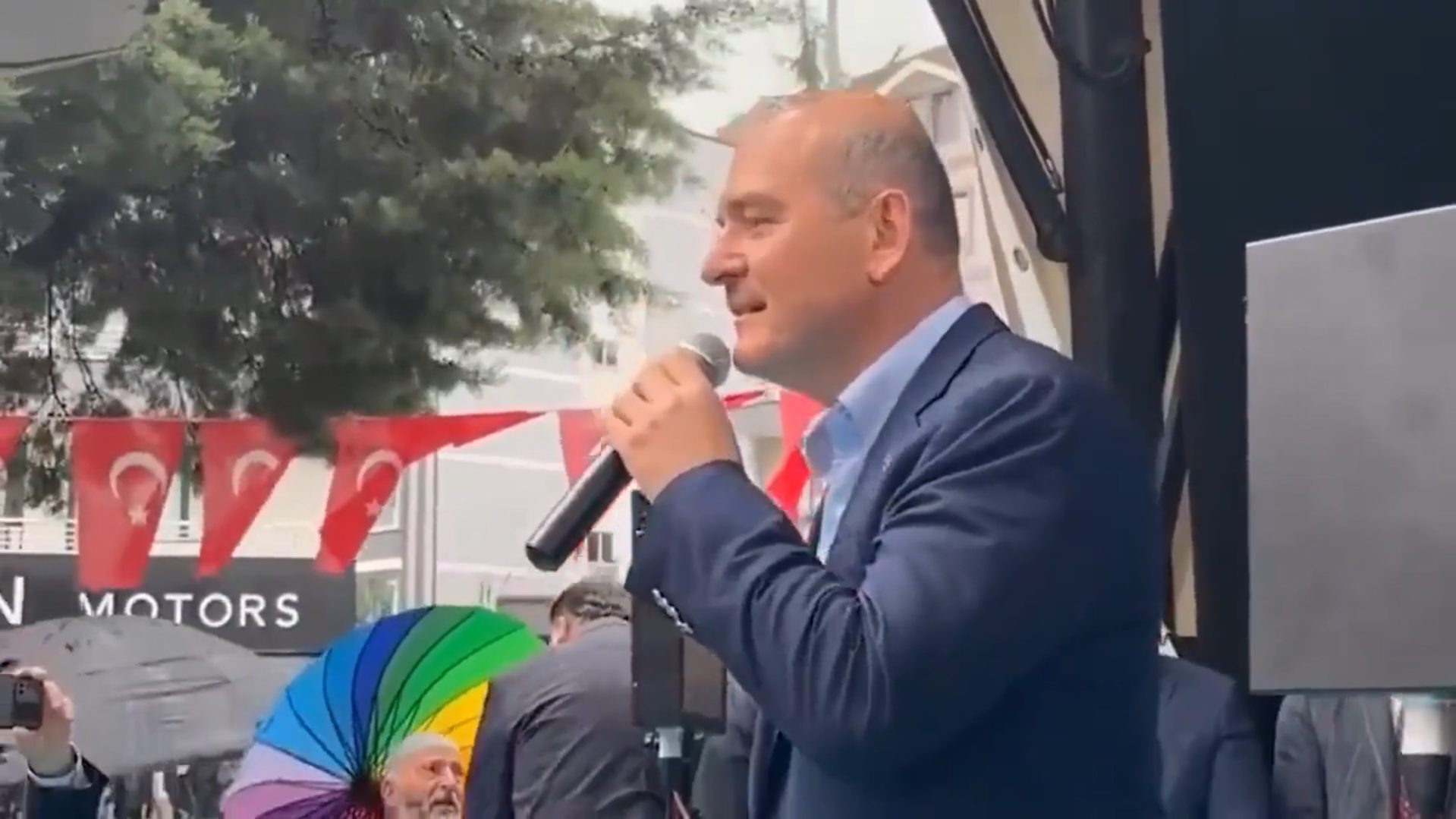 İçişleri Bakanı Süleyman Soylu, Trabzon'da vatandaşlara seslendi. Soylu'nun konuşması sırasında yaşlı bir kişi gökkuşağı desenli şemsiyesinin açarak yağmurdan korunmak istedi.
