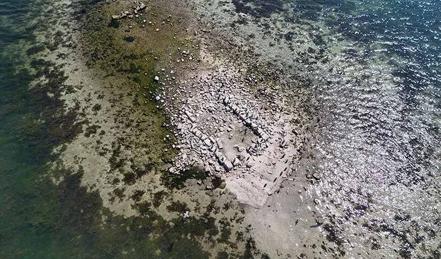 Daha önceki yıllarda da suyun çekilmesiyle ortaya çıkan Kartepe kıyılarına 300 metre mesafedeki yapının tarihi bir kilise kalıntısı olduğu biliniyor. Dikkat çeken manzara, dron ile görüntülendi.