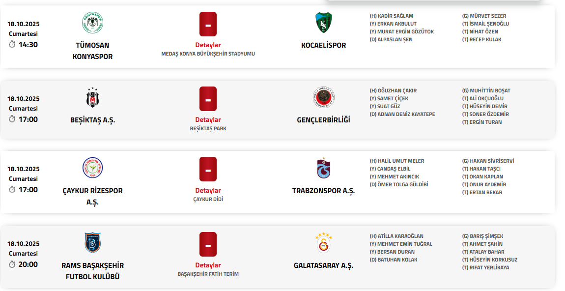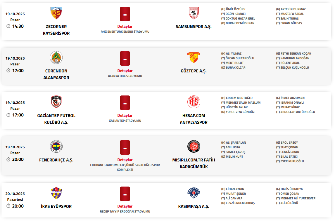 19 Ekim Pazar akşamı saat 20.00'de başlayacak olan Fenerbahçe-F. Karagümrük mücadelesinde ise Ali Şansalan görev yapacak.