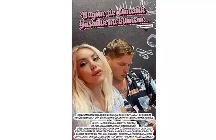 Açıklamasında hamile olduğunu da müjdeleyen Özden, "Güzel haberlerini almak tek dileğim. Biz zorlukları başarmak için birleştik. Güzel bir haber bile verememek çok üzücü. Bir iletişim olsa onu kendine getirebilirdim vereceğim haberle ama çaresizlik beni de onu da geriyor. Bu zorluğu bizim için çekiyor, ailesi için çabalıyor. Dünyaların en güzel şeylerini hak ediyor pırlanta kalbi. Sözümden dönmeden bekliyorum babamız" ifadelerini kullandı.