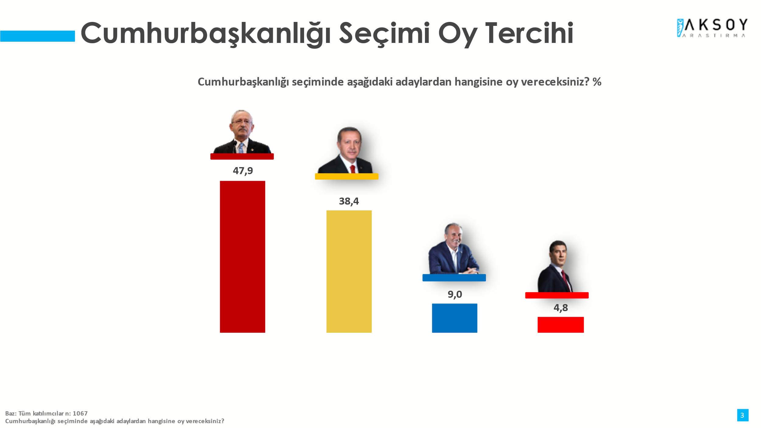 Aksoy Araştırmanın anketine göre, seçimler 1. turda tamamlanmazken ilk turda Muharrem İnce faktörüne rağmen Millet İttifakı'nın Cumhurbaşkanı adayı Kemal Kılıçdaroğlu, AKP'li Cumhurbaşkanı Recep Tayyip Erdoğan'a yaklaşık 10 puanlık bir fark atıyor. Kılıçdaroğlu 1. turda yüzde 47,9 oy alırken Erdoğan yüzde 38,4 Muharrem İnce yüzde 9,0 Sinan Oğan ise yüzde 4,8 oy oranına ulaşıyor.