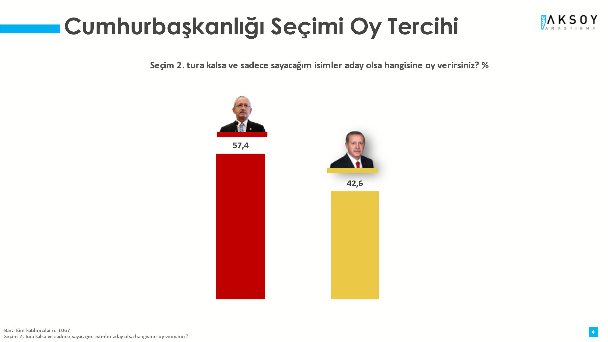 Seçimi kazanabilmek için Türkiye tarihinin en karanlık ittifaklarından birini kuran AKP'li Cumhurbaşkanı Recep Tayyip Erdoğan Aksoy Araştırma'nın anketine göre 2. turda rakibi Millet İttifakı'nın Cumhurbaşkanı adayı Kemal Kılıçdaroğlu'na tarihi bir farkla mağlup oluyor. 2. turda Kılıçdaroğlu yüzde 57,4 oy oranına ulaşırken Erdoğan yüzde 42,6 oy oranında kalıyor.