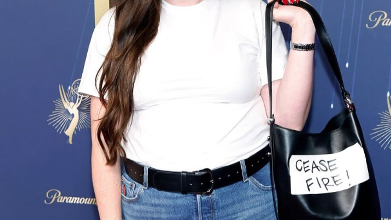 ABD'li komedyen ve oyuncu Megan Stalter da törene üzerinde "Ateşkes" yazan bir çanta ile katıldı.