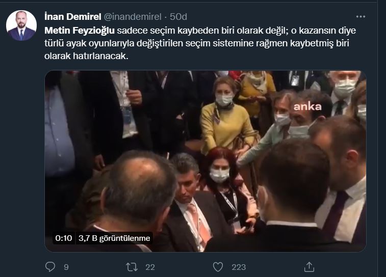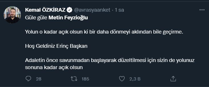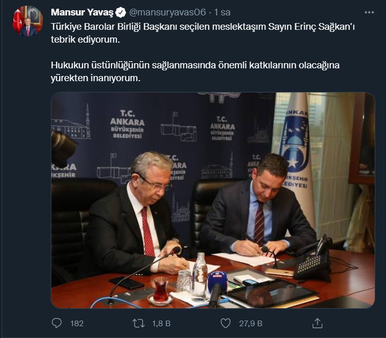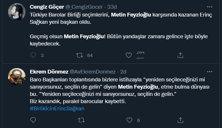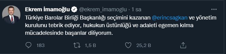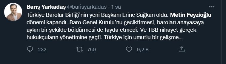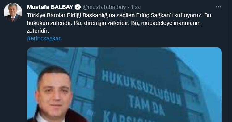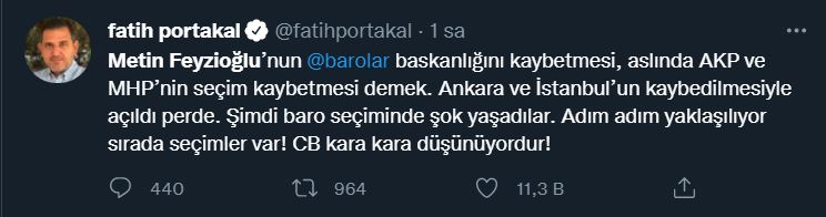 baskanlığını kaybetmesi, aslında AKP ve MHP’nin seçim kaybetmesi demek. Ankara ve İstanbul’un kaybedilmesiyle açıldı perde. Şimdi baro seçiminde şok yaşadılar. Adım adım yaklaşılıyor sırada seçimler var! CB kara kara düşünüyordur!" ifadeleri dükkat çekti