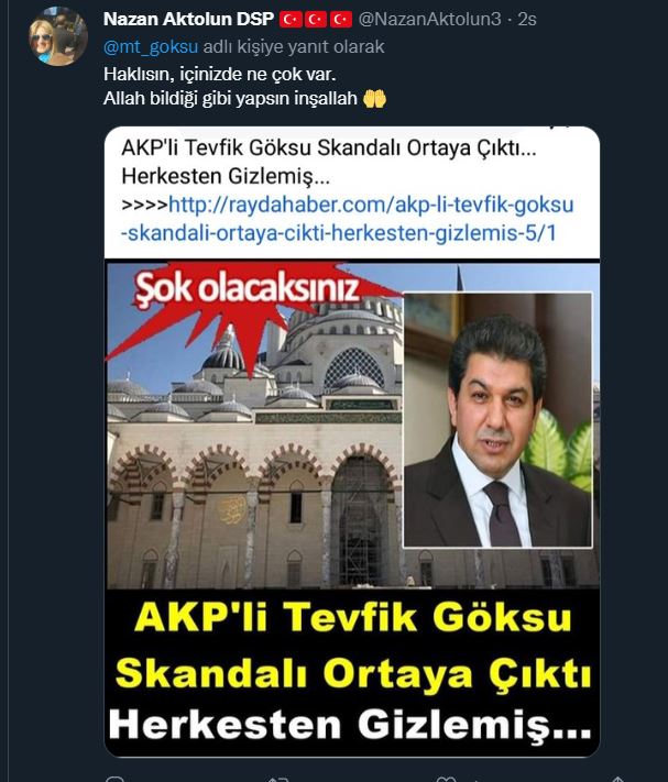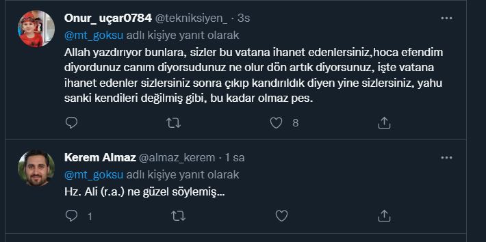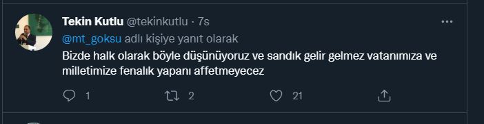 AKP'li Tevfik Göksu kendisine ait sosyal medya hesabından Hz. Ali'nin "Şahsınıza fenalık eden bir düşmanı affediniz. Lakin vatanınıza ve milletinize fenalık eden bir kimseyi asla affetmeyiniz." sözünü paylaştı.  Sosyal medya kullanıcıları kısa sürede Göksu'nun tweetine tepki yağdırdı.